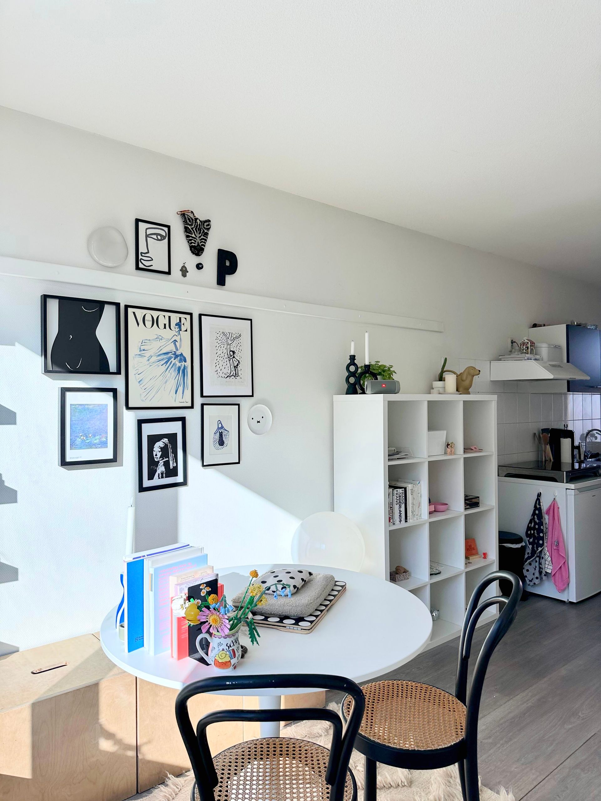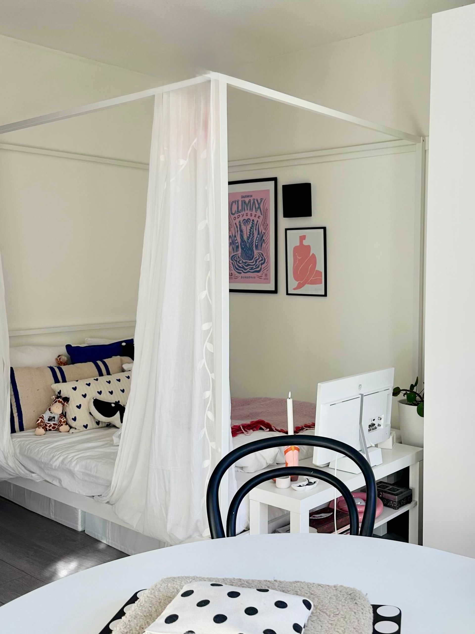 In mijn huidige studio moest ik het helemaal opnieuw aanpakken. Zoals allemaal nieuwe meubels regelen en ook ineens een eettafel, stoelen en een badkamer inrichten. Toch was dit ook heel leuk omdat het nu helemaal in mijn eigen stijl kon. Veel van mijn meubels komen van IKEA, mijn favoriete woonwinkel. Daarnaast heb ik ook veel spullen tweedehands gekocht via Marktplaats of bij de kringloop, zoals mijn koelkast, eetkamerstoelen en verschillende decoratiestukken. Daardoor was ik een stuk goedkoper uit. Ook heb ik wat spullen van mijn moeder meenomen, zoals een kleed, lampen en sierkussens voor op mijn bed. Hierdoor voelt mijn studio extra gezellig aan en lijkt het een beetje op thuis.